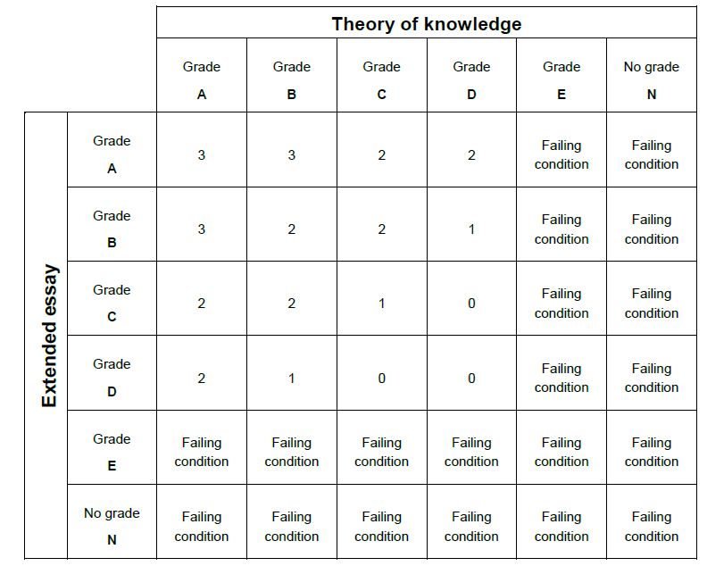For students completing the IB Diploma, their are multiple criteria that all must be met. This includes: marks in their six IB classes (on a scale of 1-7) that total to 24 or higher, passing grades in their EE and TOK, and completion of CAS. If all those criteria are met, there is the possibility of students earning ‘bonus points’. The following diagram shows the IB Points Matrix and how many bonus points a student may earn: